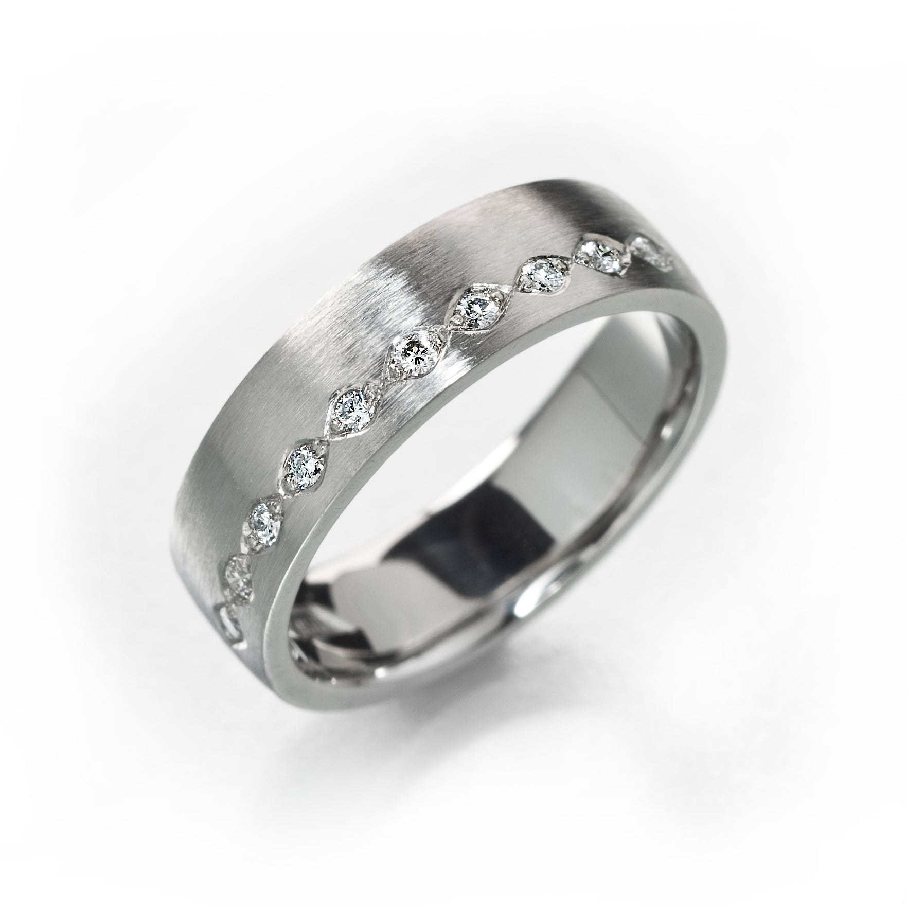 Hienostunut ja vahva muunnelma perinteisestä rivitimanttisormuksesta.
