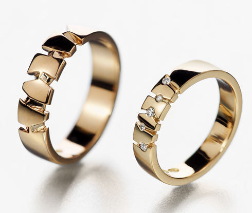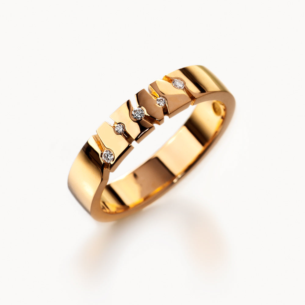 Rohkea, mutta hienostunut sormus, jonka jokaiseen ainutlaatuiseen viivaan on istutettu timantti.